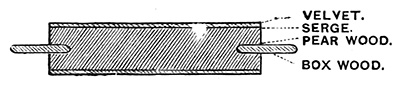 Velvet Rollers have latterly come much into use, and are very successfully used for inking-up the transfers in photo-lithography. They may be also used in photo-xylography and photo-ceramic processes, and also for certain purposes in collotype. A necessary precaution is that the seam of the velvet should always be kept off the surface subjected to the rolling, and this may be carried out if the roller is, say, 10-1/2 centimetres in diameter, a length of 31·2 centimetres may then be rolled without using the seam. The sketch will explain the construction. The cylinder or stock is of pear-wood, and the handles of box; first covering serge, which before sewing on should be well shrunk in hot water; over this comes the velvet, the edges of which must not overlap, but must be drawn together as close as39 possible by means of thread. One advantage of this roller is that it is ready for immediate use; it must, after use, be carefully cleaned before being placed aside; this is best done by repeated rollings on a clean slab, and the judicious application of a little turpentine. Turpentine only may be used to thin ink for use with this roller.