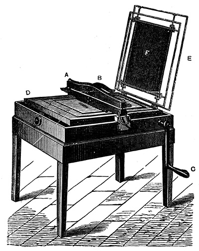 40 The Press is an indispensable requisite for printing operations. There are small wooden hand-presses, especially constructed for collotype, which may be purchased at a very low price—£4 to £5; but the more economical way is to procure a small lithographic press constructed of iron. This will not only be found more durable, but it may, if occasion arise, be used either for lithographic or zincographic printing, as it will bear the necessary pressure, which is greatly in excess of that applied in collotype printing. The hand-press constructed by Sutter is a form that may be strongly recommended. If the output of prints is to be large, a steam machine will be necessary, the cost of which will be not less than £200 to £250. Fig. 6 represents a press which has been largely used for collotype. is the bed or carriage upon which the plate is fixed in the manner described further on. By turning the crank handle the bed is carried under the scraper, which is secured in the scraper-box . The scraper is kept in position by the lever . The scraper-box is represented as closed down in the illustration, but in actual practice it would not be in the position shown until the tympan-frame had been lowered.