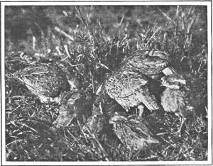 In my notebooks the nest of the ruffed grouse figures as a hollow in the ground, lined with dead leaves or pine needles. The eggs range from seven to twelve; in one case fifteen. The mother does not commonly cover them on leaving the nest; although a bird was once seen to do so by dropping straws and leaves on her back and then sliding out from under.