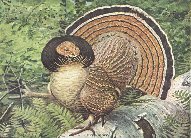 The drumming of a ruffed grouse is like the sound of a rattlesnake: only those who have heard it know what it is like. It seems to come from any part of the thicket or woods, like the voice of a ventriloquist. Sometimes it resembles distant thunder or the rumble of wheels. Early in spring the male steps cautiously out on a log, first making sure that no fox or weasel is hiding near. His rich chestnut hue, with purple or bronze on the ruffs, and white-barred tail, harmonizes beautifully with the shadows of the surrounding spruce thicket. Then he rises on tiptoe, and with wings held out a little way from the body begins his thump, thump, thump—faster and faster until it dies away in a mere rumbling. Hunters at one time supposed that this sound was made by the wings striking against the log or stump; but it is now known to be produced by rapid vibration of the quill feathers. Usually there are hen grouse nearby who sneak up through the leaves to watch his performance. He takes them all if he can find them, for the grouse cock prefers a harem; and they go about in a flock together. Day after day the drummer returns to his favorite log, until the warm weather comes on.