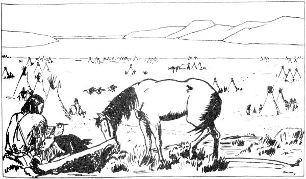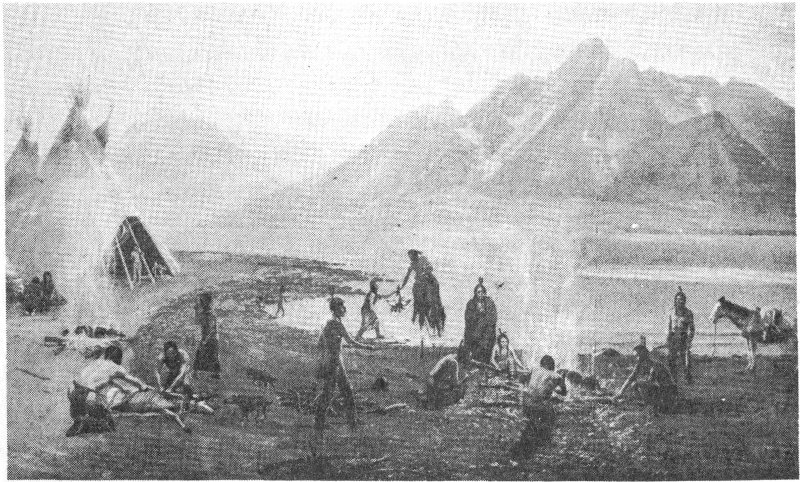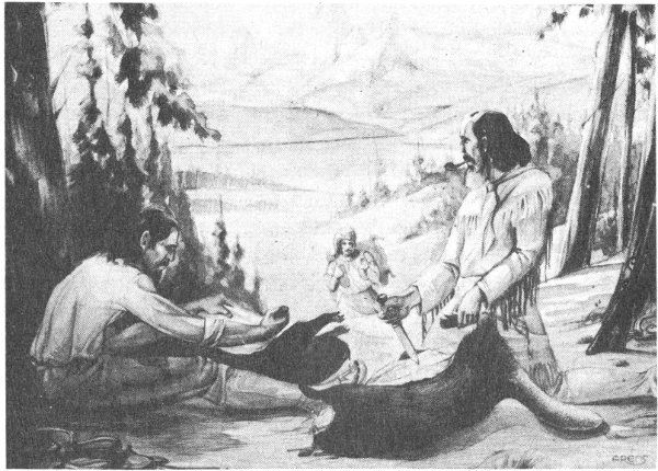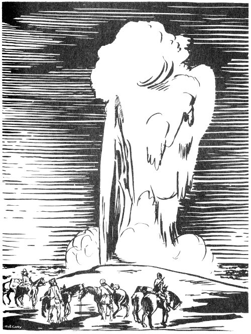 Upon their return trip in 1806, after wintering at Fort Clatsop at the mouth of the Columbia, Lewis and Clark divided in order to explore the country more thoroughly, the latter undertaking to determine the source of the mysterious Yellowstone. On July 15, with eleven white men, the Indian woman Sacajawea and her baby, the cavalcade crossed Bozeman Pass, which marks the divide between the Yellowstone and Gallatin Fork, and reached the vicinity of present Livingston, Montana. Never suspecting what wonders lay concealed behind the snowy mountain wall to the south, Clark hurried on down the river to rejoin Lewis, with glory enough for one expedition.