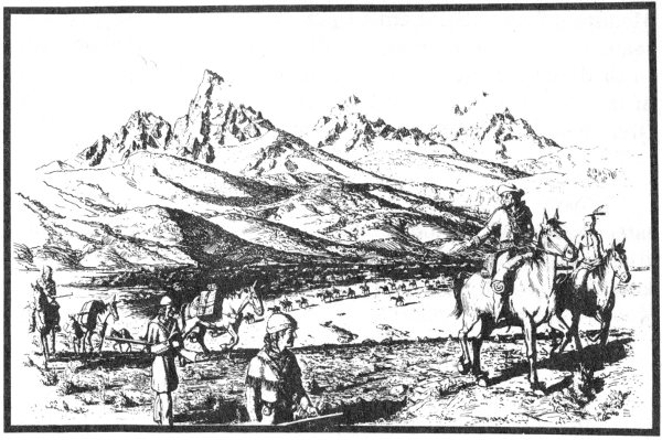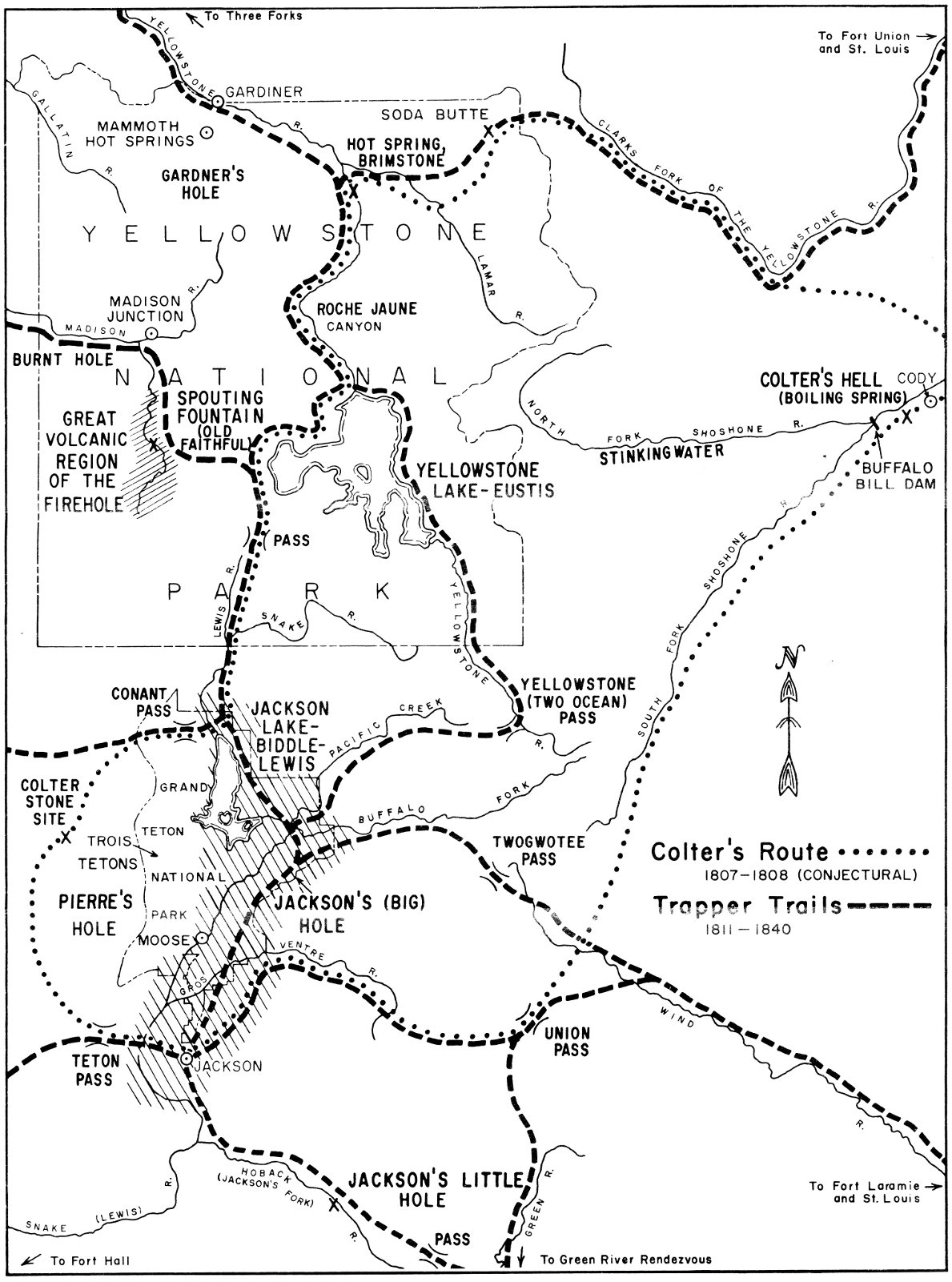 A composite of theories offered by Hiram M. Chittenden, Stallo Vinton, Charles Lindsay, and Burton Harris, to mention only four qualified scholars who have undertaken to hypothecate Colter’s route, is that Colter ascended the Bighorn, followed up the Shoshone River to near present Cody, went south along the foot of the Absaroka Mountains, up Wind River to Union Pass, into Jackson’s Hole, thence probably across Teton Pass into Pierre’s Hole, thence north via Conant Pass to the west shore of Yellowstone Lake and northeast to the crossing of the Yellowstone near Tower Falls, thence up the Lamar River and Soda Butte Creek, 15 back across the Absarokas, thence south to the Shoshone River, and back to Lisa’s Fort by way of Clark’s Fork and Pryor’s Fork.