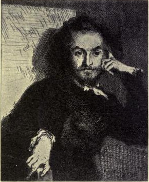 The Manet portrait of Charles Baudelaire, dated 1862, is exquisite, ironical, subtle, enigmatical, astonishing; He has arrested the head and shoulders of the poet in an instant's vision; the outlines are definite, clear, severe, and simple. One sees the eager head thrust forward, as if the man were actually walking; the fine and delicate nose, voluptuously dilated in the nostrils, seems to breathe in vague perfumes; the mouth, half-seen, has a touch of his malicious irony; the right eye shines vividly in a fixed glance, those eyes that had the colour of Spanish tobacco. Over the long, waving hair, that seems to be swept backward by the wind, is placed, with unerring skill, at the exact angle, that top-hat that Baudelaire had to have expressly made to fit the size of his head. Around his long neck is just seen the white soft collar of his shirt, with a twisted tie in front. In this picture one sees the inspired poet, with distinct touches of this strong piece of thinking flesh and blood. And Manet indicates, I think, that glimpse of the soul which one needs in a perfect likeness.