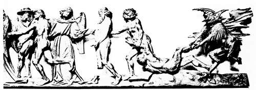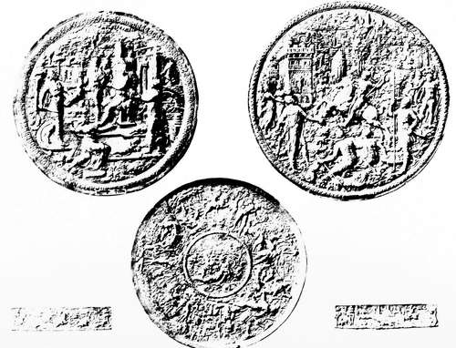 1) Scylla und Minos. K. P. 203. Katal. 528 (dort irrtümlich Aeneas und Dido bezeichnet). Rund. Durchm. 0,182 m. Bleiguß.
