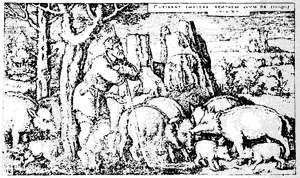 Wir finden in den Werken des H. G. alle jene Stoffe behandelt, die die Kleinmeister in der zweiten Hälfte des 16. Jahrhunderts bevorzugten: Darstellungen aus der klassischen Götter- und Sagenwelt, biblische Scenen, symbolische Vorwürfe und Jagdstücke. Die mit kurzem verständlichem Text begleiteten Emblemata, die Neuwen Figuren, Biblische, Ovidische, Livische etc. »allen Künstlern, als Malern, Goldschmieden, Bildhauwern, Steinmetzen, Schreinern etc. fast dienstlich vnd nützlich«, gaben neben den größeren illustrierten Werken und den zahllosen Einzelblättern auch dem weniger Gebildeten reichlich Gelegenheit und Anregung zur Behandlung derartiger Stoffe. Das Gewissen der Kleinmeister, selbst der vermögendsten, war nach modernen Begriffen sehr weit: wenn sie sich auch meist eine gewisse Originalität in der Art der Behandlung des Stoffes wahren, den Gedanken, einzelne Teile des Ganzen eignen sie sich ohne Bedenken an[54]. Auch bei dem Meister H. G., der sicherlich den besten seiner Zeit zuzugesellen ist, können wir diese Erfahrung machen. Die Art und Weise, wie er seine figürlichen Scenen in tiefe, abwechslungsreiche Landschaften hineinkomponiert, die Behandlung der Bäume, besonders auch der Baumstämme, der blumen- und grasbedeckte Untergrund, die fadenartige Wiedergabe des Rauches, weisen unbedingt auf Flötner als sein Vorbild hin, nur daß uns Alles überladener, manirierter entgegentritt. In dem Wasser, das selten seinen Landschaften fehlt, schlagen Delphine, Schiffe und Kähne schwimmen darauf, Inseln und Gestade sind bedeckt mit teilweise phantastischen Gebäuden. Von den Blumen, mit denen der Boden übersät ist, bevorzugt er eine stilisierte Tulpenart mit weit hervortretendem Stempel oder große Anemonen. Die Baumstämme sind häufig stark gebogen, wie vom Sturme gepeitscht. Besonders charakteristisch aber sind seine Wolken, die, in der Weise des Moderno, aus einzelnen Teilchen bestehen, deren jedes aussieht, wie ein auf einen Spieß gesteckter Darm. Das Relief seiner Figuren ist durchschnittlich höher, als bei Flötner. Die Personen, in antiker Gewandung, die Männer meist bärtig, sind schlank und muskulös, elegant in Haltung und Bewegung, die Gestikulation der Hände von dramatischer Bewegtheit, ohne daß ein störend unruhiger Eindruck hervorgerufen würde. Die Tiere, die meist gallopierend dargestellt werden, sind ebenmäßig und natürlich gebaut. Bei dem Anblicke der Werke des H. G., die sich ausnahmslos durch vorzügliche Komposition und Perspektive auszeichnen, wird man sich des Eindruckes nicht erwehren können, daß man es mit einem hervorragenden Künstler zu thun hat.