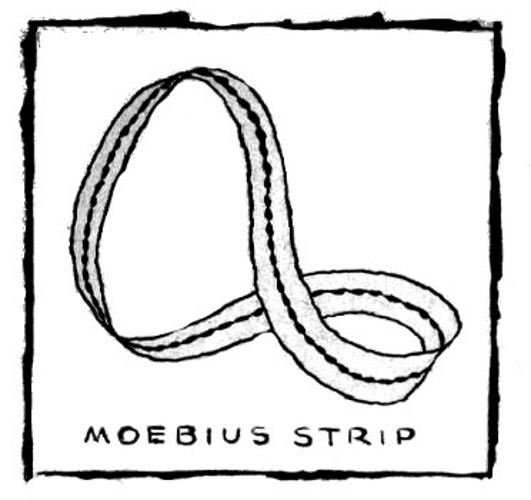 By reducing the present-past-future of man to a Moebius Strip, we have sheared away a dimension. It is a two-dimensional strip, because it has no depth. (Naturally, it would be impossible for a Moebius Strip to have depth; it has only one surface.)