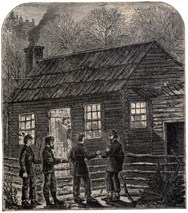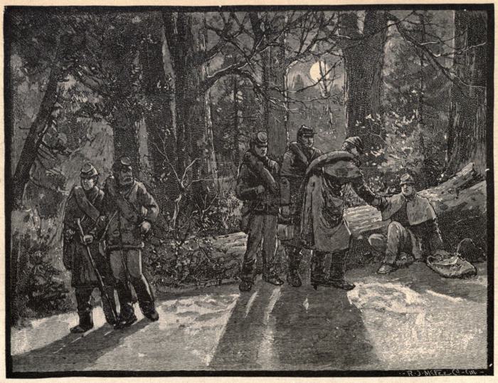 As we became deeply interested in our talk the time passed quickly. The tall forest-trees cast long shadows over us. The sun was disappearing in the west. The sky was cloudless. Our preparations for the third night of travel were complete. Soon after dusk we emerged from our hiding place, and in due time were upon the road. Our rest during the day had been refreshing, and we walked briskly forward. We passed one house early in the night. It was too early, we thought, to try our plan for procuring food, and the appearance of the house and its surroundings did not justify the belief that the occupants had any food to spare. So we passed on. Near ten o'clock we came to another house on our left. It was near the road, not more than twenty yards distant. From appearances all inside were asleep. At least no light was visible, and silence reigned. At most of[29] the houses we had passed, the dogs had barked at us. It was not so at this one. We went a few yards beyond the house and halted in the road. Five of us were to lie in wait, while the sixth went forth on the errand of necessity. Which one of us should go upon the errand was a question for decision. It was decided by drawing cuts. Taylor was chosen to attempt the experiment. Taylor's overcoat was of a light-gray color, and had once belonged to a Confederate soldier. Smith's cap was also of "secesh" antecedents. Taylor donned them both, and was to play the Confederate soldier on furlough. He was to go to the front door of the house and knock. When the door was opened to him, if he was asked to come in he was to decline on the pretext of not having time. He was then to apply for something to eat, enough for himself and two comrades a supper that night and breakfast the next morning, which would suffice for one meal for our party. He was to insist on immediate compliance to the request on the plea that he and his comrades were hungry and obliged to march all night. If asked why so? he was to answer that they had been home on furlough, that their time was nearly out, and that they must report to the company by a certain time—we had anticipated many questions that we judged would be asked, and had answers to suit.