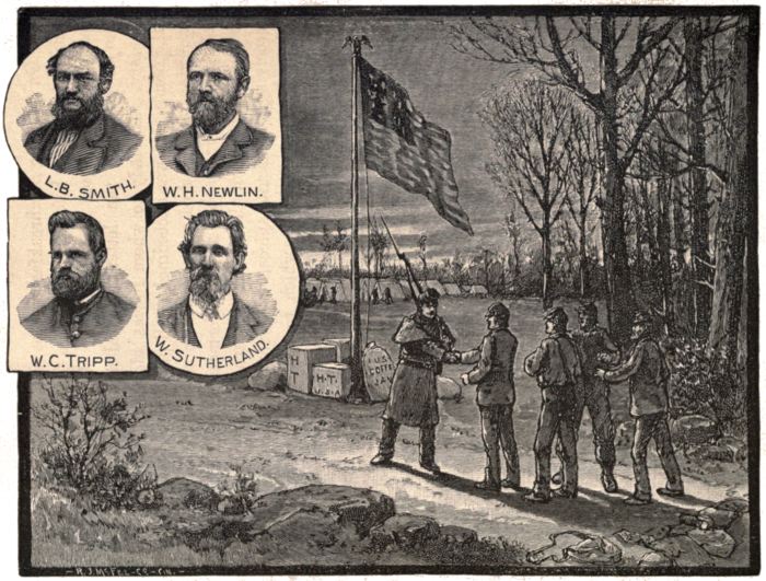 We listened a moment longer, but heard nothing. We then gathered our haversacks and blankets, and started westward through the woods. We had gone but a few steps before we heard the noise of persons climbing the fence. We halted and[19] remained perfectly still, as we were not sure the rebels were not on our trail. Soon we could distinguish the forms of two persons in the moonlight. They were moving toward the point of timber we had just left. We now knew they were Smith and Taylor, and soon had the pleasure of hearing our names called in low, subdued tones by their familiar voices. Our whereabouts was soon made known to them, and they were soon with us. Smith and Taylor wished to know why we had not stopped in the point of timber, as agreed upon. We told them we had stopped there, had waited some time for them, and had given them up as lost, and then started on our journey alone, getting as far as that before hearing them.
