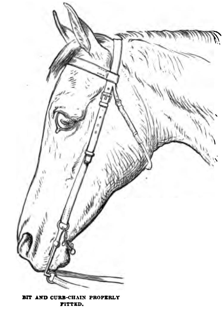 At the suggestion of the groom the headstall was provided with several inches of chain next to the animal's head, so as to discourage any possible inclination he might have to bite it. Some horses will use their teeth on anything, and if they once succeed in gnawing off their halters and getting loose it is not easy to break them of the habit.