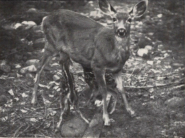 The seasonal migration is a noteworthy characteristic. With the coming of spring, deer move upward from the lowlands, closely following the retreating snow. The young are born in late May or June, usually after the does have reached their summer range, although they may move higher to find relief from flies. There is practically no banding together of the deer at this time. Each mother and her offspring, usually twins, sometimes one and rarely three, comprise a family group, and tend to keep to themselves. The fawns are hidden at birth, and remain in some secluded spot until they are several days old. The mother visits them at intervals during the day so that they may be fed, and stays near their place of concealment. Almost every season “abandoned” fawns are discovered and brought in to one or another of the park’s ranger stations by well-meaning but ill-informed park visitors. In exceptionally rare instances the mother may have been killed by some predator or a passing automobile, but under no known circumstances has a fawn ever been deliberately abandoned. Fawns, if found, should be left unmolested.