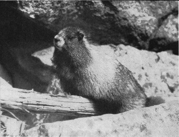 This beautiful and graceful member of the weasel family is chiefly seen after nightfall, but is also occasionally encountered along the trails during the day. At Paradise Valley a pair lived in the old Community House for several years, and were the source of a keen thrill to the visitors who saw them playing around the building. For the most part the marten is a resident of the dense forest. It is an expert climber, travels through the trees almost as well as a squirrel, and is equally at home among the talus slopes where it searches for conies.