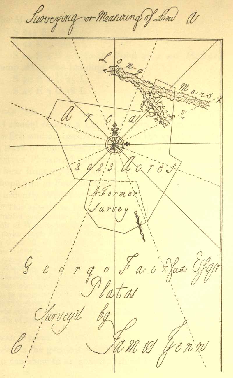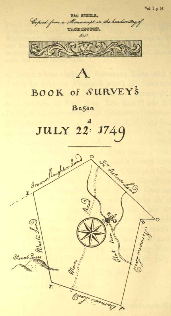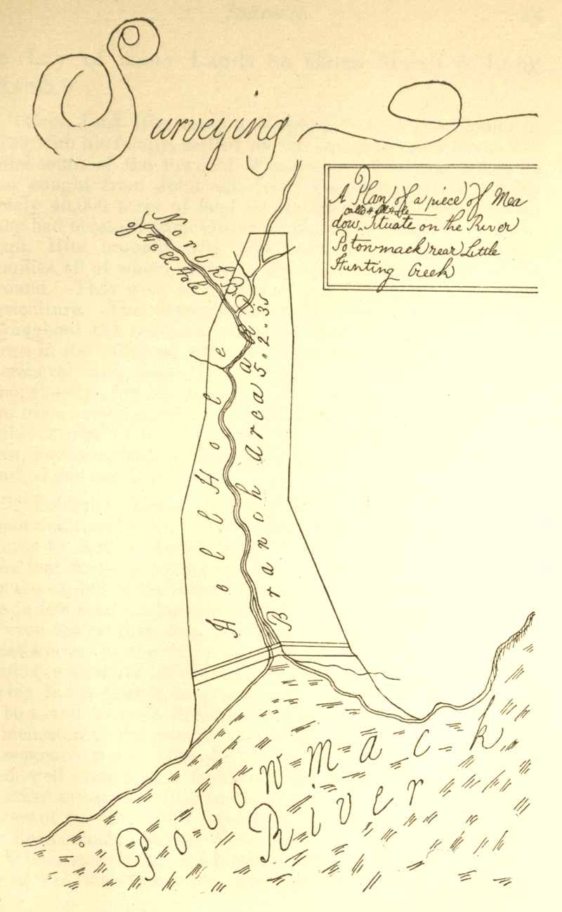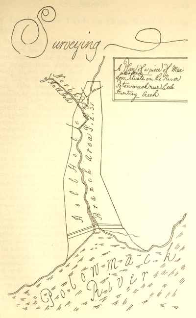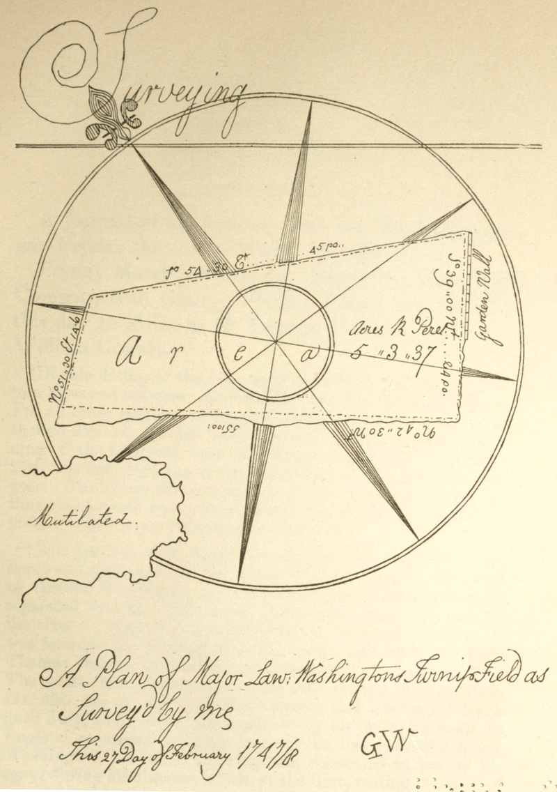George Washington's aptitude for mathematics early attracted the attention of his teachers, and his beautifully kept copy-books, which are still preserved, attest his unusual ability in mathematical demonstra[11]tion and diagrams. Mr. Williams, the principal of the Academy in Westmoreland county, Va., where young Washington was, to give a practical value to this mathematical talent, had added surveying and navigation to his other studies; and these were soon mastered by this bright pupil. Land surveying was then a profitable and genteel pursuit in the colonies, and it comported well with Washington's tastes and inclinations. While visiting his brother at Mount Vernon, he had repeatedly amused himself and entertained guests of the house by surveying, in their presence, the garden, or a field, and rapidly drawing plats of them as an exercise. A few maps of such early surveys have been preserved. One of them, of Lawrence Washington's turnip field, bearing date 27 Feb., 1747-8, is reproduced in fac-simile in this publication. The others are without date, but are of about the same period; although one, namely that of "Hell Hole," a part of the Mount Vernon estate, and frequently mentioned in Washington's later diaries, may have been an earlier production. A fac-simile of it may also be found in this work.