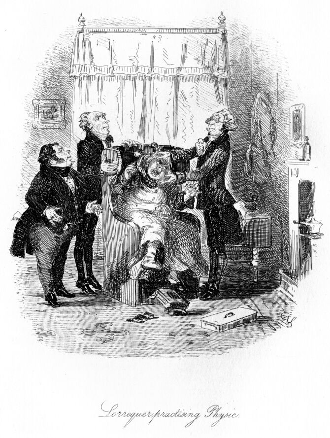 I at once expressed the great happiness it afforded me to meet such highly informed and justly celebrated gentlemen; and fearing every moment the arrival of the real Simon Pure should cover me with shame and disgrace, begged they would afford me as soon as possible, some history of the case we were concerned for. They accordingly proceeded to expound in a species of duet, some curious particulars of an old gentleman who had the evil fortune to have them for his doctors, and who laboured under some swelling of the neck, which they differed as to the treatment of, and in consequence of which, the aid of a third party (myself, God bless the mark!) was requested.