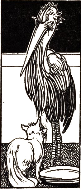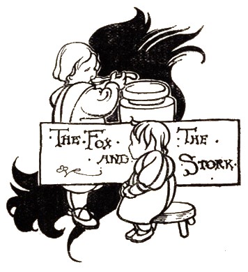A fox one day invited a Stork to dinner, and being disposed to divert himself at the expense of his guest, provided nothing for dinner but some thin soup in a shallow dish. This the Fox lapped up very readily, while the Stork, unable to gain a mouthful with her long narrow bill, was as hungry at the end of dinner as when she began. The Fox, meanwhile, said he was very sorry to see her eat so sparingly, and hoped that the dish was seasoned to her mind. The Stork, seeing that she was played upon, took no notice of it, but pretended to enjoy herself extremely; and at parting begged the Fox to return the visit. So he agreed to dine with her the next day. He arrived in good time, and dinner was ordered forthwith; but when it was served up, he found to his dismay, that it was nothing but minced meat in a tall, narrow-necked jar. Down this the Stork easily thrust her long neck and bill, while the Fox had to content himself with licking the outside of the jar. "I am very glad," said the Stork, "that you seem to have so good an appetite; and I hope you will make as hearty a dinner at my table as I did the other day at yours." At this the Fox hung down his head and showed his teeth—"Nay, nay," said the Stork, "don't pretend to be out of humour about the matter; they that cannot take a jest should never make one."