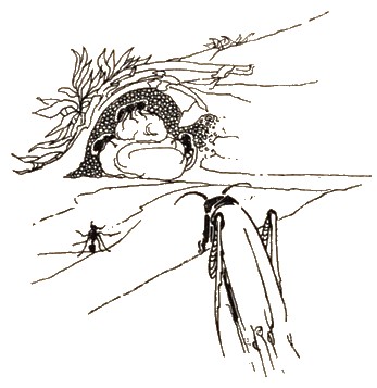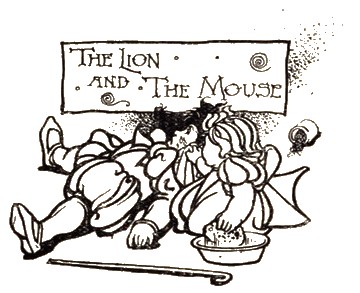 A lion was sleeping in his lair, when a Mouse, not looking where he was going, ran over the mighty beast's nose and awakened him. The Lion clapped his paw on the frightened little creature, and was about to make an end of him in a moment, when the Mouse, in pitiable tone, begged him to spare one who had done him wrong without being aware. The Lion looking kindly on his little prisoner's fright, generously let him go. Now it happened, no long time after, that the Lion, while ranging the woods for his prey, fell into the toils of the hunters; and finding himself entangled without hope of escape, set up a roar that filled the whole forest with its echo. The Mouse, quickly recognising the Lion's voice, ran to the spot, and without more ado set to work to nibble the knot in the cord that bound him, and in a short time, set him free; thus showing him that kindness is seldom thrown away, and that there is no creature so much below another but that he may have it in his power to return a good deed.