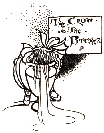 A crow, ready to die with thirst, flew with joy to a Pitcher, which he saw at a distance. But when he came up to it, he found the water so low that with all his stooping and straining he was unable to reach it. Thereupon he tried to break the Pitcher; then to overturn it; but his strength was not sufficient to do either. At last, seeing some small pebbles lie near the place, he cast them one by one into the Pitcher; and thus, by degrees, raised the water up to the very brim, and quenched his thirst.