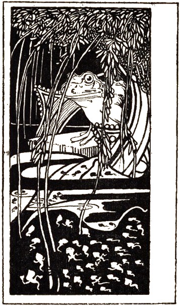 Long ago, when the Frogs were all at liberty in the lakes, and had grown quite weary of following every one his own devices, they assembled one day together and with a great clamour petitioned Jupiter to let them have a king to keep them in better order and make them lead honester lives. Jupiter, knowing their foolishness, smiled at their request, and threw down a log into the lake, which by the huge splash and commotion it made, sent the whole nation of Frogs into the greatest terror and amazement. They rushed under the water and into the mud, and dared not come within a leap's-length of the spot where it lay. At length one Frog bolder than the rest ventured to pop his head above the water, and take a look at their new king from a respectful distance. Presently when they saw the log lie stock-still, others began to swim up to it and around it, till by degrees growing bolder and bolder, they at last leaped upon it and treated it with the greatest contempt. Full of disgust for so tame a ruler, they carried a petition a second time to Jupiter for another and more active King. Upon which he sent them a stork, who had no sooner come among them, than he began laying hold of them, and devouring them one by one as fast as he could, and it was in vain that they tried to escape him. Then they sent Mercury with a private message to Jupiter, begging him to take pity on them once more; but Jupiter replied that they were only suffering the punishment due to their folly, and that another time they would learn to let well alone, and not be dissatisfied with their natural state.