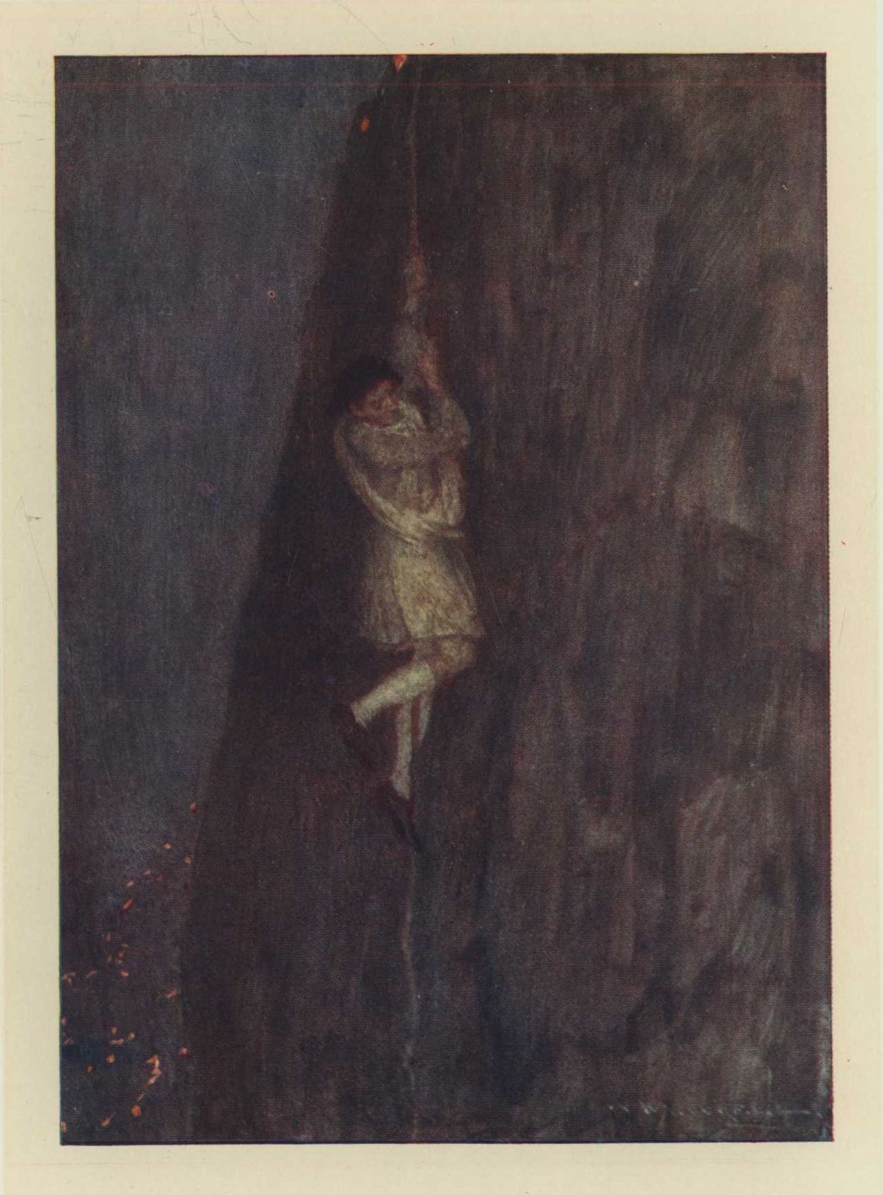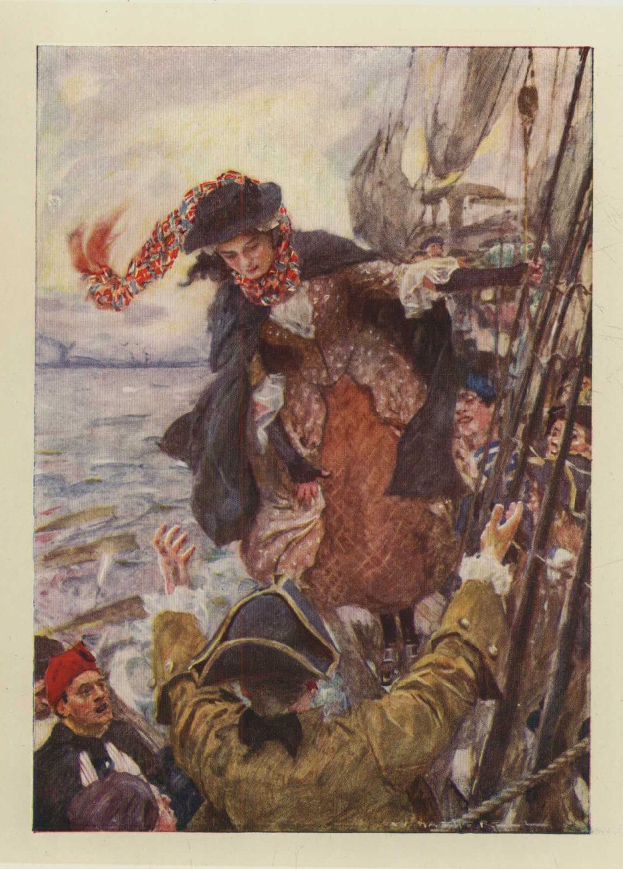 "I began to think I had made a fool's bargain, that it was merely impossible Catriona should be got on board to me, and that I stood to be set ashore in Helvoet all by myself ... But this was to reckon without the lass's courage ... Up she stood on the bulwarks and held by a stay, the wind blowing in her petticoats, which made the enterprise more dangerous, and gave us rather more a view of her stockings than would be thought genteel in cities"—(Catriona.)
