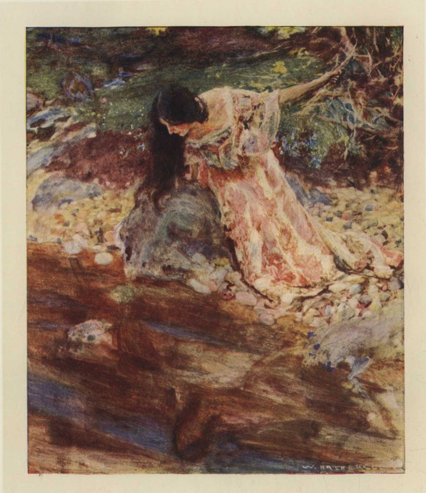 "At length when she was well weary, she came upon a wide and shallow pool. Stones stood in it, like islands; bulrushes fringed the coast; the floor was paved with pine needles; and the pines themselves, whose roots made promontories, looked down silently on their green images. She crept to the margin and beheld herself with wonder, a hollow and bright-eyed phantom, in the ruins of her palace robe ... She addressed herself to make a toilette by that forest mirror, washed herself pure from all the stains of her adventure, took off her jewels and wrapped them in her handkerchief, re-arranged the tatters of her dress, and took down the folds of her hair. She shook it round her face, and the pool repeated her thus veiled." (Prince Otto.)