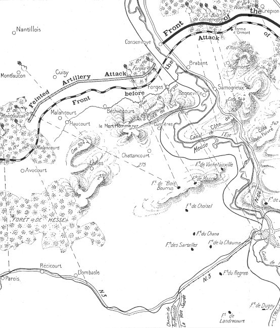 On the 25th, the 37th I.D., with orders to defend Talou Hill and Louvemont village, resisted for a long time against incredibly furious attacks, but on their right the enemy succeeded in capturing Vauche [Pg 12] Wood and, advancing towards Douaumont, carried the fort by surprise. However, their efforts to take the village failed before the heroic tenacity of the 31st Brigade, while the 94th D.I. covered itself with glory. The enemy advance from this side, had the effect of compelling the 31st I.D. to abandon Talou Hill. During this time the line in Woevre was, unknown to the Germans, voluntarily withdrawn to the foot of the Meuse hills, where the French only retained outposts at Fresnes and Manheulles.