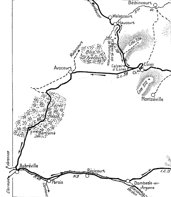 After the battle of the Marne, the Crown Prince established his positions of resistance north of the fortress, on the line Malancourt—Brabant—Haumont—Maucourt. On September 15th, General Sarrail slipped in from this side the 6th C.A. and 72nd R.D., which were sent beyond the advance forts. The enemy sought to isolate and approach Verdun at the same time. The combats which occurred successively on the initiative of each side were indecisive on the north, but not on the S.E.