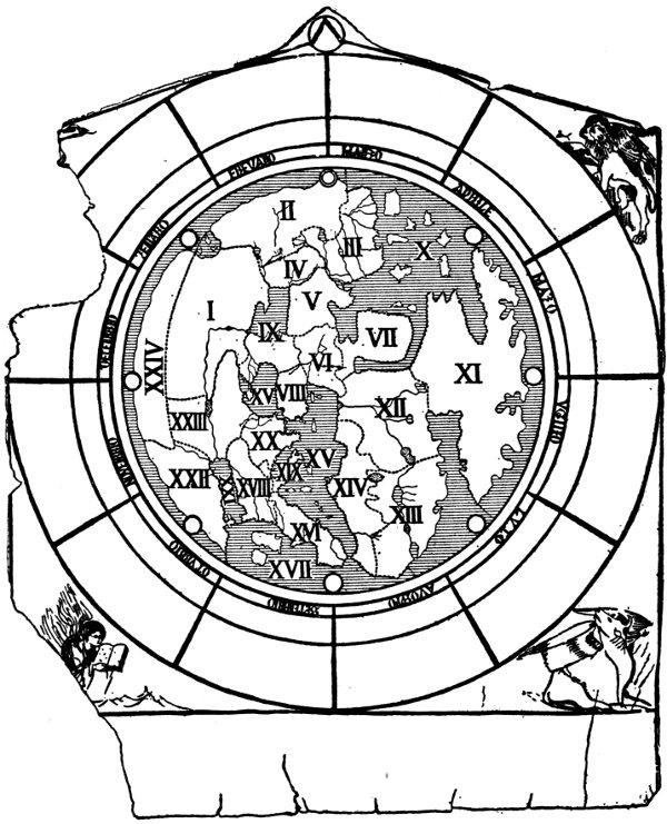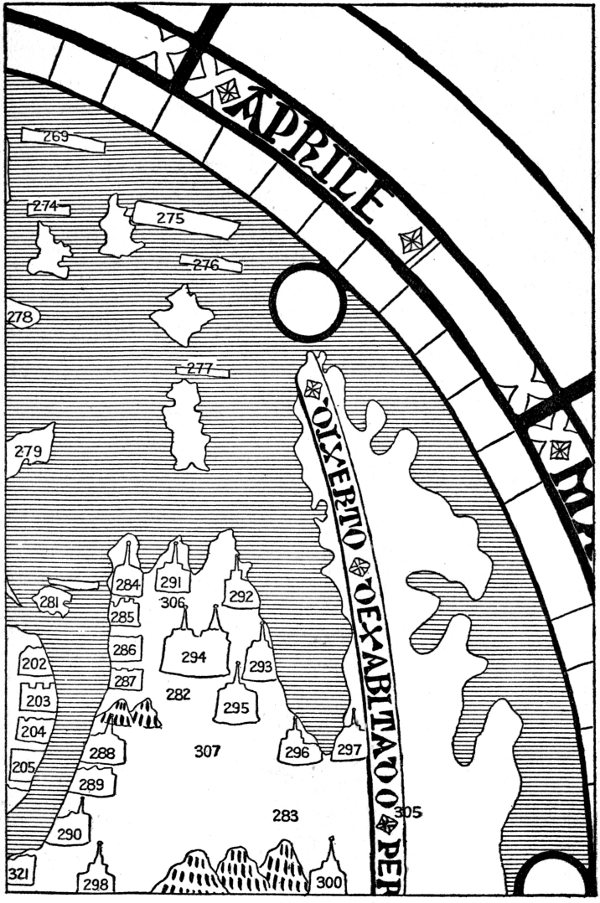 The calendars encircling Leardo’s three maps constitute exceptional additions. Of these calendars, the one on the Society’s map is the most interesting. The inscription in the panel below the circles, in part an explanation of the calendar, is somewhat awkwardly phrased in the Venetian dialect of the fifteenth century, but, although it lacks the beginning of each line, the meaning is fairly clear, especially when certain of the missing lines are reconstructed from the corresponding inscription on the map in Vicenza.[6]