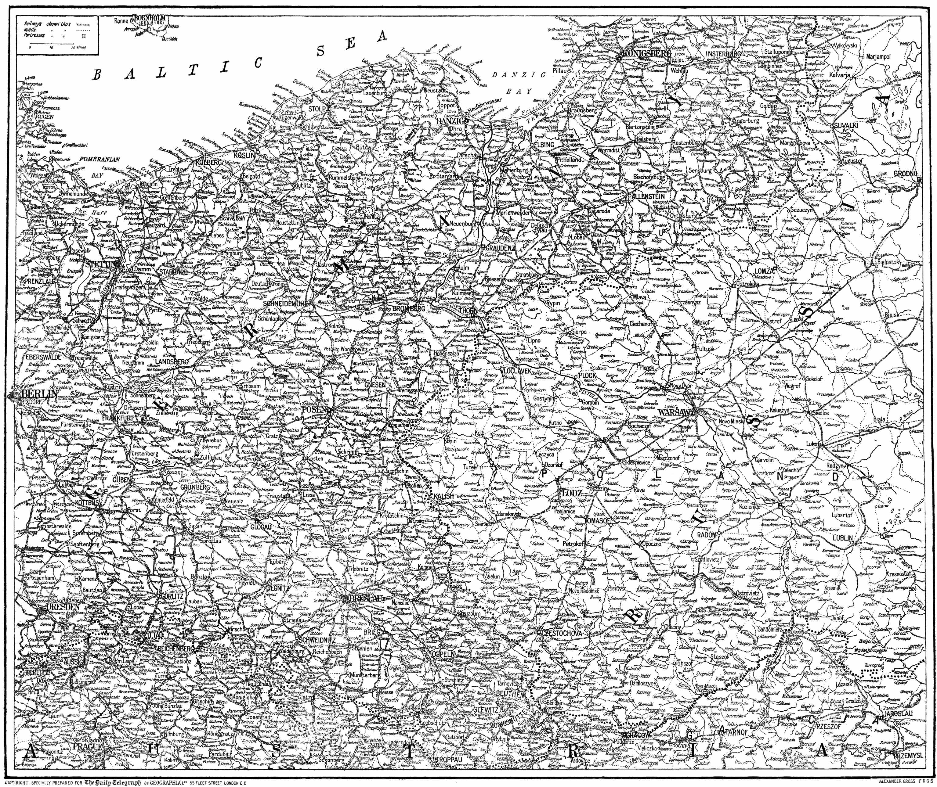 A secondary cause contributing to General Bankal’s failure was the lack of German support from Posen. This was the direct result of General Rennenkampf’s successful offensive in Eastern Prussia. In the previous chapter it was shown how, after the battle of Gumbinnen and the rapid advance through Allenstein, the Germans brought up several army corps to cope with the menace. They drove back Rennenkampf, but only at the cost of starving their offensive in Poland. They were unable to reinforce both the defensive line of the Vistula and the armies attacking Poland, unless they154 withdrew a portion of their forces from the western theatre of war. In spite of rumours, it may be stated for certain that no such withdrawal took place. There was no apparent diminution of German power in the west, and no reinforcements arrived in Poland.