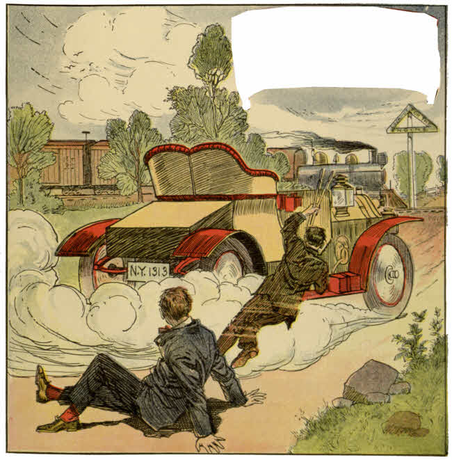 Just then the runabout blew up a forward tire. The machine tried to turn a somersault, and its passenger went over on the hood and tried to knock off one of the gas lamps with his head. When Matt brought the touring car to the side of the runabout, and halted, the man was on his feet, shaking his fist at the silent white tormentor.