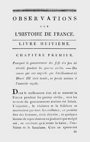 La France paroissoit destinée à obéir à un pouvoir arbitraire, et elle y auroit été conduite sans éprouver d’agitation violente, si le prince eût toujours eu une conduite assez adroite pour contenir les grands par les magistrats, et les magistrats par les grands; mais à quelles infortunes nos pères n’étoient-ils pas encore condamnés, s’il montoit sur le trône des rois foibles, et qui, ne connoissant pas le danger qui les menaçoit, abandonneroient le soin de leur autorité? Dès-lors toutes les passions devoient acquérir un nouveau degré d’activité. Toutes les arrières-vues des grands et du parlement devoient se montrer à découvert, et produire des désordres d’autant plus grands, que chacune de ces factions étant incapable de se conduire et d’être unie par un intérêt général, devoit produire des cabales et des partis différens, dont le choc pouvoit renverser les fondemens de l’état.