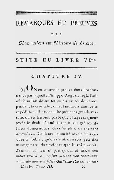 Les successeurs de Hugues-Capet, jusqu’à S. Louis, ne furent législateurs que dans leurs domaines; et pourquoi se seroient-ils soumis à porter leurs ordonnances au parlement, puisque les seigneurs qui y siégeoient, convaincus de la plénitude de leur pouvoir, n’y portoient eux-mêmes ni les lois qu’ils faisoient pour leurs sujets, ni les traités qu’ils passoient avec leurs vassaux? Quand ces seigneurs donnèrent des chartes de commune à leurs villes, on demanda quelquefois la garantie du roi; mais on ne trouve aucun exemple que ces pièces aient été envoyées à sa cour, pour que l’enregistrement leur 31 donnât force de lois. Il est démontré, par la prodigieuse variété des coutumes qui étoient répandues dans le royaume, qu’on n’y connoissoit point une puissance législative qui s’étendît sur tout le corps de la nation; il auroit donc été absurde qu’il y eût une compagnie chargée d’enregistrer les lois chimériques d’une puissance qui n’existoit pas. S. Louis, il est vrai, publia quelques-unes de ses ordonnances au parlement, et son fils, qui n’étoit pas encore reconnu incontestablement pour législateur, suivit cet exemple. Mais, par-là, ces deux princes ne remplissoient point un devoir qui leur fût prescrit par la coutume; ils ne cherchoient qu’à préparer les esprits à l’obéissance, et accréditer l’opinion naissante de leur législation. Ce n’est pas même cette conduite que tinrent quelquefois S. Louis et son fils, qu’on doit regarder comme l’origine de l’enregistrement, puisque cette coutume tomba dans l’oubli à mesure que le parlement et l’administration de la justice prirent une forme nouvelle par l’établissement des appels et la qualité des personnes qui composèrent le parlement, quand les seigneurs eurent renoncé au droit de juger.