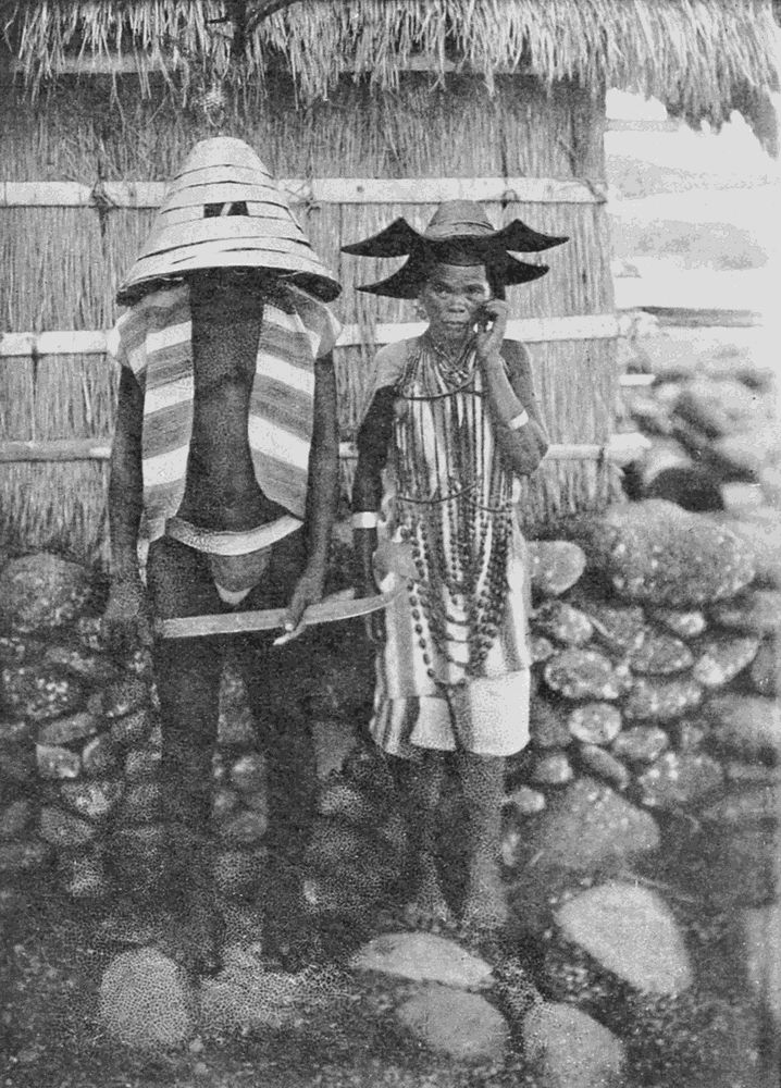 MAN AND WOMAN OF YAMI TRIBE IN REGALIA WORN AT THE SPRING FESTIVAL IN HONOUR OF THE SEA-GOD.