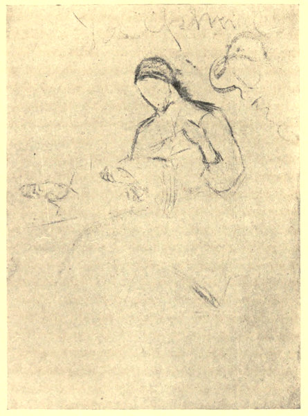 61One more instance of the connection of the art side with the constructive side. The children had been studying primitive spinning and carding, when one of them, twelve years of age, made a picture of one of the older children spinning. Here is another piece of work which is not quite average; it is better than the average. It is an illustration of two hands and the drawing out of the wool to get it ready for spinning. This was done by a child eleven years of age. But, upon the whole, with the younger children especially, the art impulse is connected mainly with the social instinct—the desire to tell, to represent.