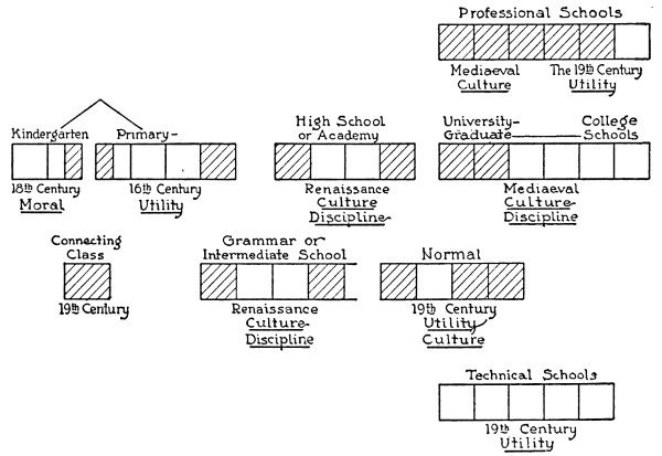 The blocks represent the various elements in the school system, and are intended to indicate roughly the length of time given to each division, and also the overlapping, both in time and subjects studied, of the individual parts of the system. With each block is given the historical conditions in which it arose and its ruling ideal.