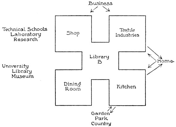 The next chart (III) is an enlargement of the second. The school building has swelled out, so to speak, the surrounding environment remaining the same, the home, the garden and country, the relation to business life and the university. The object is to show what the school must become to get out of its isolation and secure the organic 94connection with social life of which we have been speaking. It is not our architect’s plan for the school building that we hope to have; but it is a diagrammatic representation of the idea which we want embodied in the school building. On the lower side you see the dining-room and the kitchen, at the top the wood and metal shops, and the textile room for sewing and weaving. The center represents the manner in which all come together in the library; that is to say, in a collection of the intellectual resources of all kinds that throw light upon the practical work, that give it meaning and liberal value. If the four corners represent practice, the interior represents the theory of the practical activities. In other words, the object of these forms of practice in the school is not found chiefly in themselves, or in the technical skill of cooks, seamstresses, carpenters and masons, but in their connection, on the social side, with the life without; while on the individual side they respond to the child’s need of action, of expression, of desire to do something, to be constructive and creative, instead of simply passive and conforming. Their great significance is that they keep the balance between the social and individual sides—the chart symbolizing particularly the connection with the social. Here on one side is the home. How naturally the lines of connection play back and forth between the home 96and the kitchen and the textile room of the school! The child can carry over what he learns in the home and utilize it in the school; and the things learned in the school he applies at home. These are the two great things in breaking down isolation, in getting connection—to have the child come to school with all the experience he has got outside the school, and to leave it with something to be immediately used in his everyday life. The child comes to the traditional school with a healthy body and a more or less unwilling mind, though, in fact, he does not bring both his body and mind with him; he has to leave his mind behind, because there is no way to use it in the school. If he had a purely abstract mind, he could bring it to school with him, but his is a concrete one, interested in concrete things, and unless these things get over into school life, he cannot take his mind with him. What we want is to have the child come to school with a whole mind and a whole body, and leave school with a fuller mind and an even healthier body. And speaking of the body suggests that, while there is no gymnasium in these diagrams, the active life carried on in its four corners brings with it constant physical exercise, while our gymnasium proper will deal with the particular weaknesses of children and their correction, and will attempt more consciously to build up the 97thoroughly sound body as the abode of the sound mind.