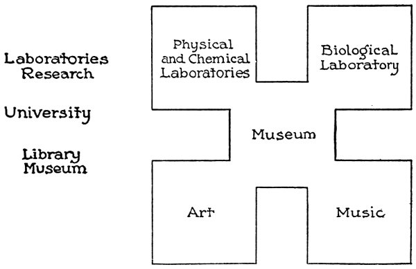 Speaking more especially with reference to the pedagogical side of the work: I suppose the oldest university chair of pedagogy in our country is about twenty years old—that of the University of Michigan, founded in the latter seventies. But there are only one or two that have tried to make a connection between theory and practice. They teach for the most part by theory, by lectures, by reference to books, rather than through the actual work of teaching itself. At Columbia, through the Teachers’ College, there is an extensive and close connection between the University and the training of teachers. 109Something has been done in one or two other places along the same line. We want an even more intimate union here, so that the University shall put all its resources at the disposition of the elementary school, contributing to the evolution of valuable subject-matter and right method, while the school in turn will be a laboratory in which the student of education sees theories and ideas demonstrated, tested, criticised, enforced, and the evolution of new truths. We want the school in its relation to the University to be a working model of a unified education.