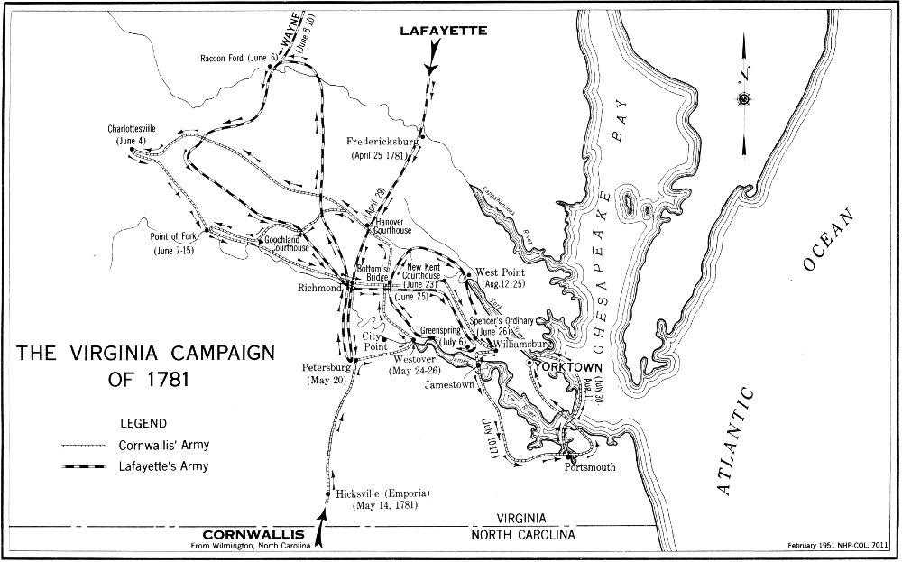 By this time there was already a considerable concentration of troops in Virginia. Gen. Alexander Leslie had been sent there with a detachment of troops in October 1780, but he had gone on to join Cornwallis in South Carolina. Shortly thereafter, another British force under Benedict Arnold was sent to operate in the area. To contain Arnold’s force, or at least to watch it, Washington had dispatched the Marquis de Lafayette to Virginia to work in conjunction with the Baron von Steuben, and later with Greene. Clinton then countered by sending Phillips with a large detachment to join Arnold. As a result of these and other moves, but by no prearranged plan, the stage was set in May 1781, for Virginia to be the battleground. From the British point of view the subjugation of the province was the tempting prize. For the Americans, the goal was to prevent this, and prevent it they did. The strategy of Yorktown was in the making, but had not yet taken form.