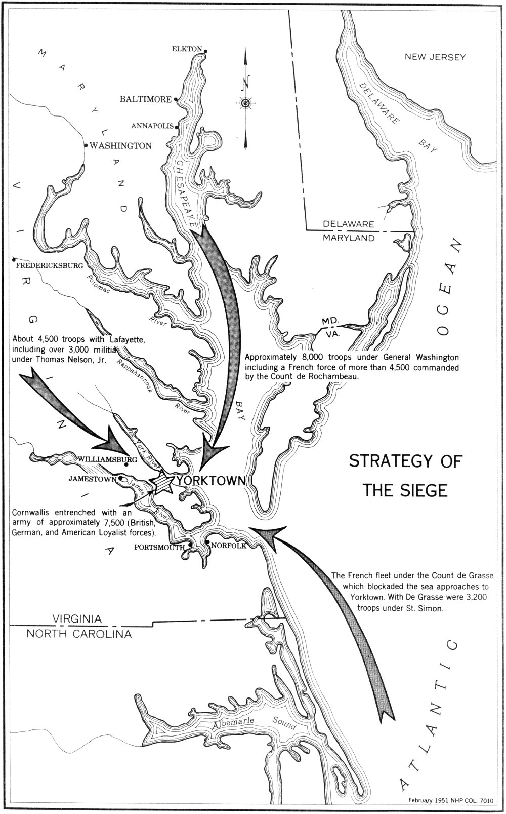 From Princeton, the march continued to Trenton where they found there were not enough ships available to transport the men and stores. The decision was to continue on foot to the head of Chesapeake Bay. The passage of the French and American troops through Philadelphia early in September became almost a festive occasion. With the American 11 units leading the way, the trek continued through Chester, Pa., and Wilmington, Del., to Head-of-Elk. It was at Chester, on September 5, that Washington learned that the Count de Grasse had arrived in the Chesapeake Bay with 28 ships of the line, a number of frigates and sloops, and 3,200 troops. At that time these troops, under the Marquis de St. Simon, had already debarked at Jamestown for union with Lafayette’s growing force.