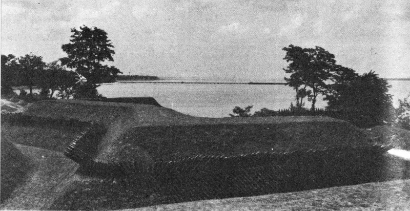 The British outer line utilized the protective features of ravines and creeks. Close on the west of Yorktown was Yorktown Creek. On the east, but at a greater distance, ran Wormley Creek. These creeks, with their marshes and irregular terrain, constituted rather formidable barriers to the rapid advance of troops. The area between the headwaters of these two creeks, however, was a weak link. This high ground, less than half a mile wide, carried the road from Yorktown to Hampton. To control this, British engineers laid out four redoubts and some gun emplacements. On the west side of Yorktown Creek, near the point where a road to Williamsburg crossed, a large star-shaped work was built. This, manned by a part of the Royal Welch Fusiliers (23d) Regiment, was known as the Fusiliers Redoubt. These positions, some works at Moore’s Mill Dam, and the two creeks constituted the British outer line at Yorktown.