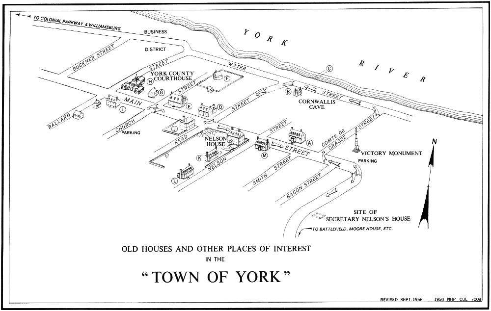 Much of the old has continued, or is being recaptured, in Yorktown and many of its buildings and sites have their individual messages. In the following text, the letters correspond to those on the map of the “Town of York,” page 46.