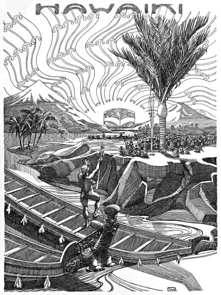 A long double sailing-canoe, with a connecting platform and a thatched deck-house amidships, put off one day long ago into the Great Ocean of Kiwa from the palm-clad shores of Tahiti the Golden, in the far South Seas. A multitude of brown people stood on the shining beach, with loud cries bidding farewell to the brave band of kinsmen who were adventuring into the vast unknown places in search of a new and wider land. In their midst, leaning on his staff, was the patriarchal chief Hou-mai-tawhiti. Bent by the weight of years was the ancient man, and his long white beard swept his breast. And as the canoe-paddles took the water and she gathered way, a voice of Hou’ was heard crying his poroporoaki, his farewell to the crew. “Go! Go! Depart to your new land. Leave war and strife behind you. Follow not after the God of War; hold to the deeds of Rongo the Peaceful. Haere! Haere! Haere atu ra!”