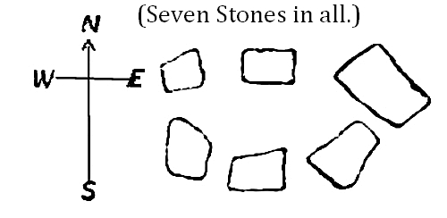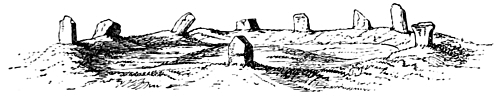 There are now only seven stones existing—all erect—and by filling up the gaps at usual distances there were thirteen stones. The average interval seems to have been 45 feet. The highest stone is 5 feet 3 inches above ground; the widest 3 feet 2 inches; and the thickest 1 foot 10 inches. The stone is of the common argillaceous slate of the district.