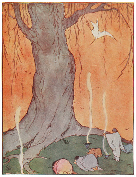 Once on a time, I was in Japan in a city called Takoshima. It rained buckets full. I was thoroughly disgusted, and not being able to walk about the streets, decorated with lanterns and weathercocks, and through the gardens full of flowers, I had to stay shut up in a [14] little room sitting on the floor, for in Japan they don’t use chairs.