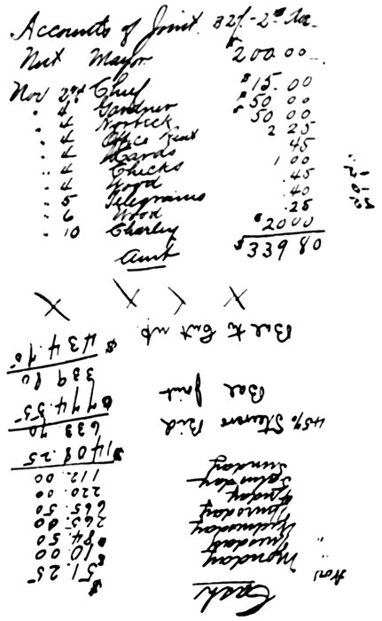 From the Assembly, bribery spread into other departments. Men empowered to issue peddlers’ licenses and permits to citizens who wished to erect awnings or use a portion of the sidewalk for storage purposes charged an amount in excess of the prices stipulated by law, and pocketed the difference. The city’s money was loaned at interest, and the interest was converted into private bank accounts. City carriages were used by the wives and children of city officials. Supplies for public 35institutions found their way to private tables; one itemized account of food furnished the poorhouse included California jellies, imported cheeses, and French wines! A member of the Assembly caused the incorporation of a grocery company, with his sons and daughters the ostensible stockholders, and succeeded in having his bid for city supplies accepted although the figures were in excess of his competitors’. In return for the favor thus shown, he indorsed a measure to award the contract for city printing to another member, and these two voted aye on a bill granting to a third the exclusive right to furnish city dispensaries with drugs.