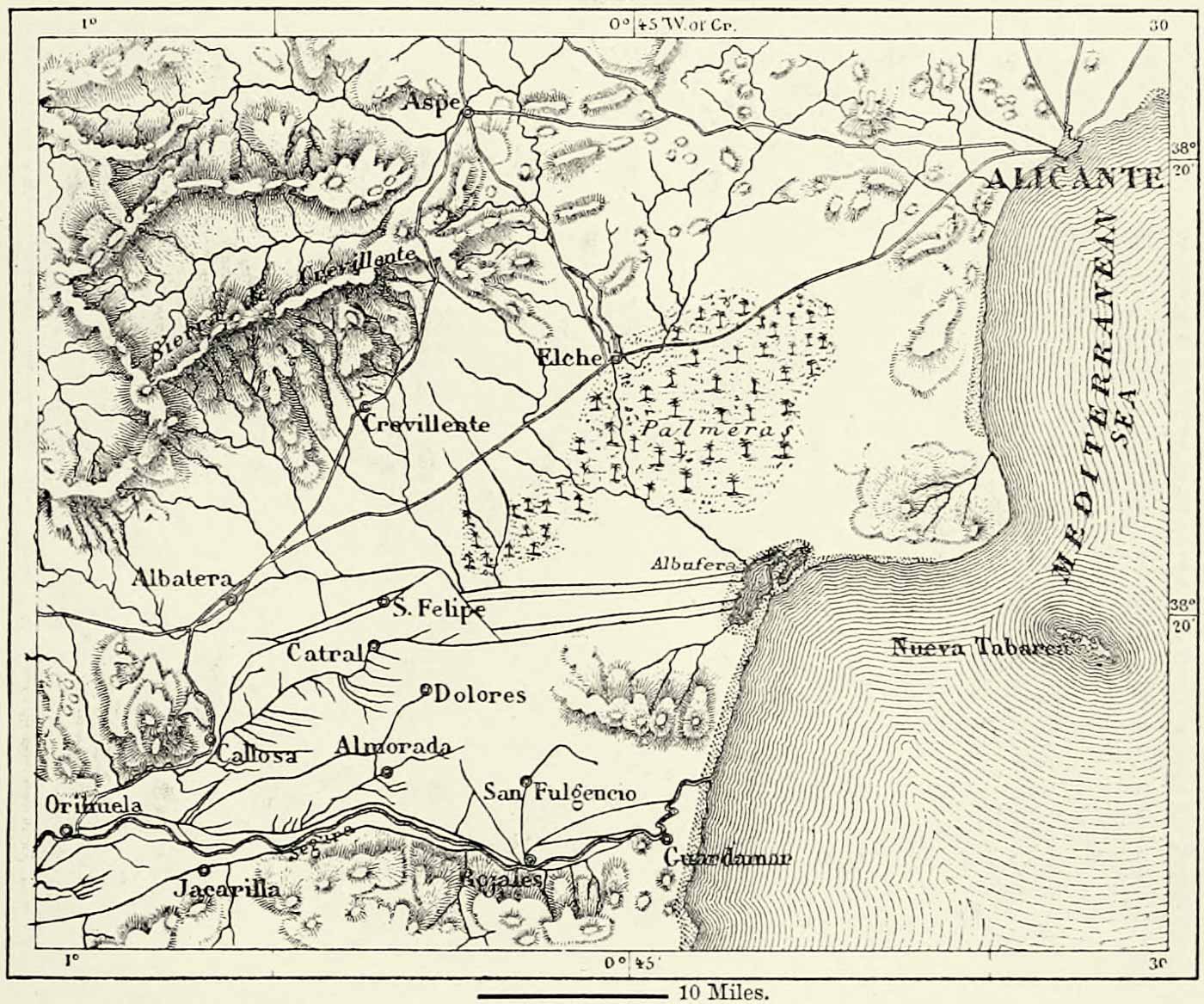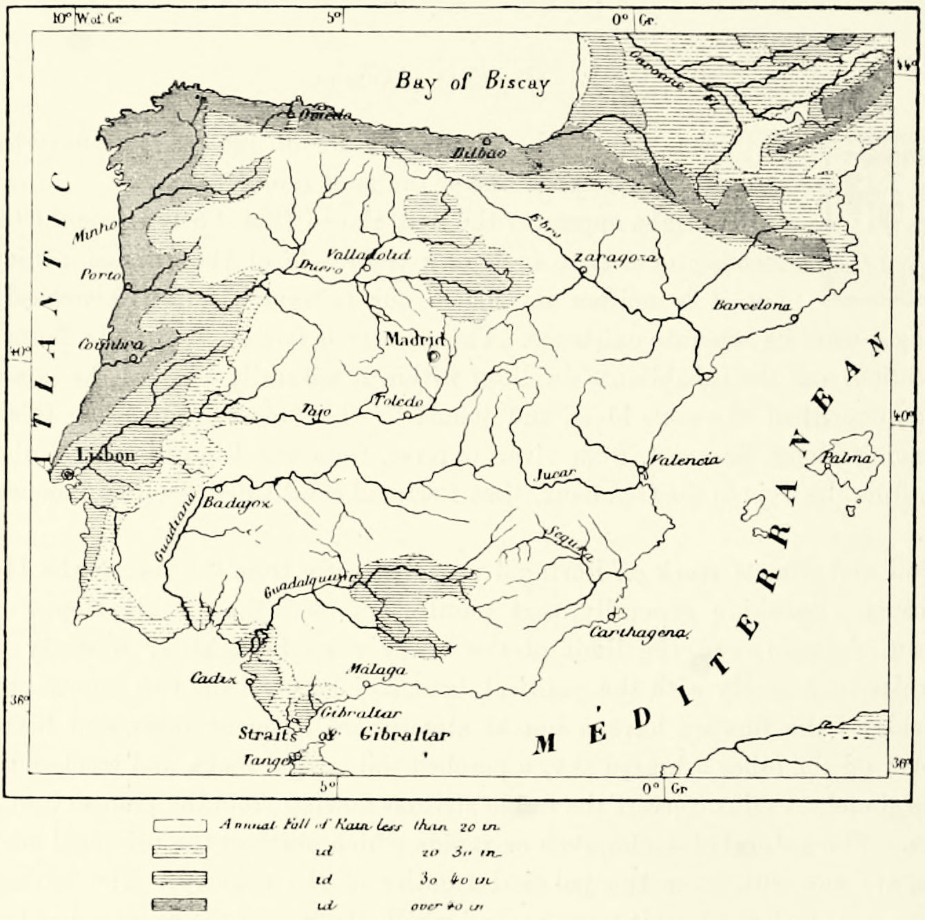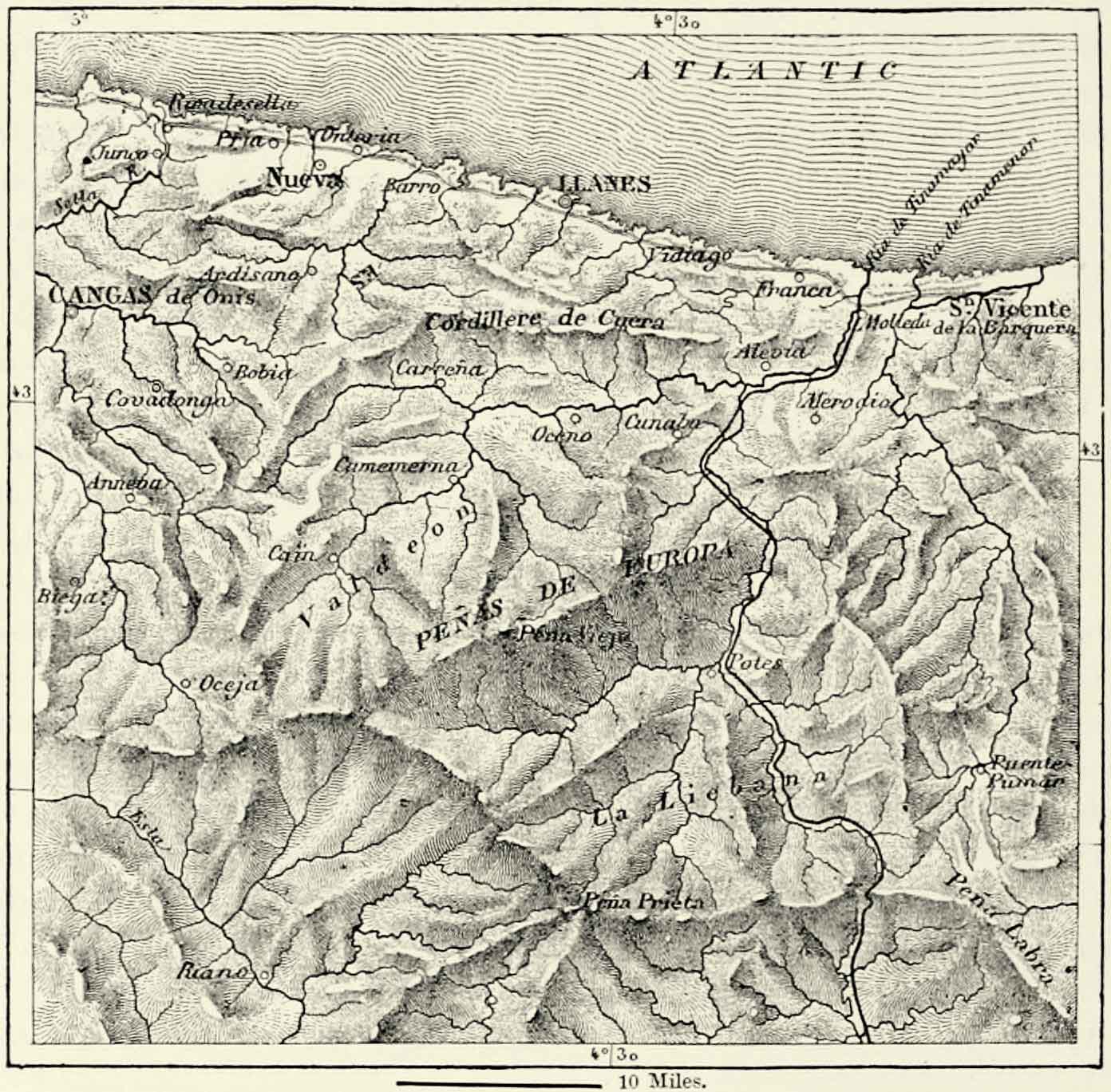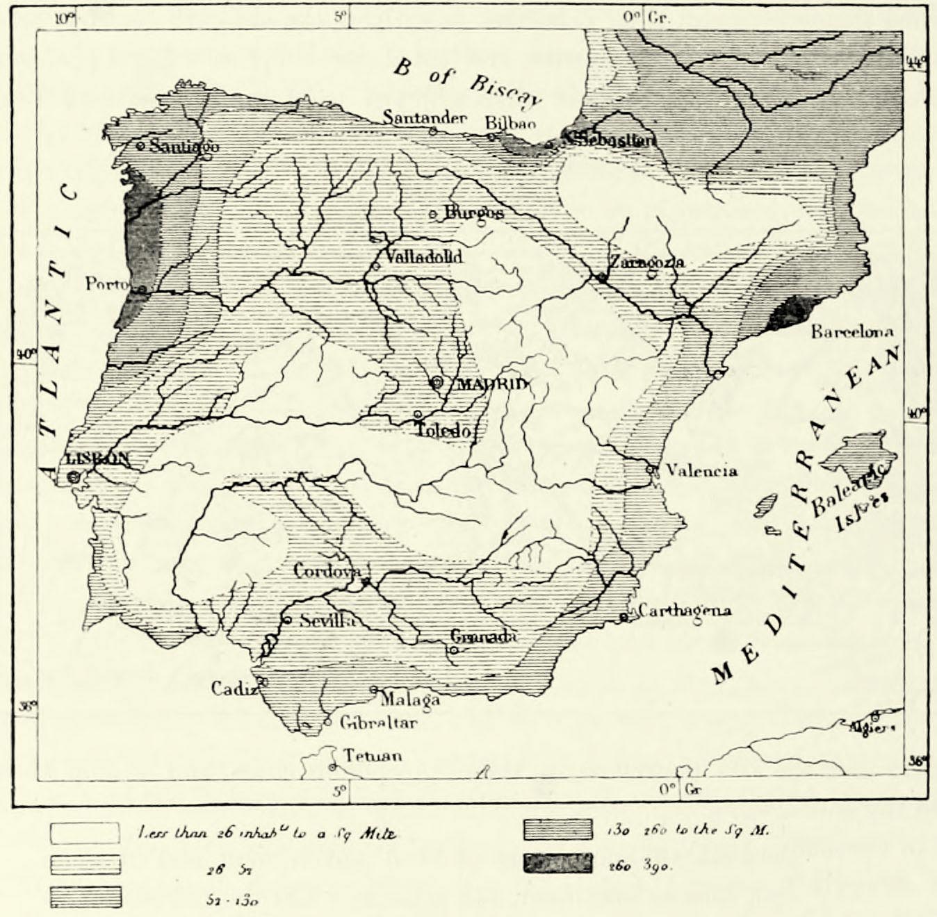 The Europe alluded to includes France, Germany, England, and the three Mediterranean peninsulas, and constitutes several natural divisions. The British Islands form one of these. The Iberian peninsula is separated scarcely less {10} distinctly from the remainder of Europe, for between it and France rises a most formidable range of mountains, the most difficult to cross in all Europe; and immediately to the north of it a depression, nowhere exceeding a height of 650 feet, extends from the Mediterranean to the Atlantic Ocean. The geographical unity of Europe is represented to the full extent only in the system of the Alps, and in the mountains of France, Germany, Italy, and the Balkan peninsula which are connected with it. It is there we must seek the framework of continental Europe.
