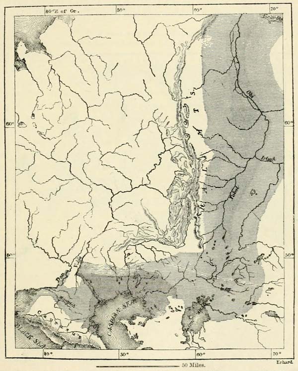 Since that epoch the limits between Europe and Asia have been shifted by geographers still further to the east. They are, however, more or less conventional, for Europe, though bounded on three sides by the ocean, is in reality but a peninsula of Asia. At the same time, the contrasts between these two parts of the world fully justify scientific men in dividing them into two continental masses. But where is the true line of separation between them? Map-makers generally adopt the political boundaries which it has pleased the Russian Government to draw between its vast European and Asiatic territories, and others adopt the summits of the Ural Mountains and of the Caucasus as the boundary between the two continents; and although, at the first glance, this delineation appears more reasonable than the former, it is in reality no less absurd. The two slopes of a mountain chain can never be assigned to different formations, and they are generally inhabited by men of the same race. The true line of separation between Europe and Asia does not consist of mountains at all, but, on the contrary, of a series of depressions, in former times covered by a channel of the sea which united the Mediterranean with the Arctic Ocean. The steppes of the Manych, between the Black Sea and the Caspian, and to the north of the Caucasus, are still covered in part with salt swamps. The Caspian itself, as well as Lake Aral and the other lakes which we meet with in the direction of the Gulf of Obi, are the remains of this ancient arm of the sea, and the intermediate regions still bear the traces of having been an ancient sea-bed.