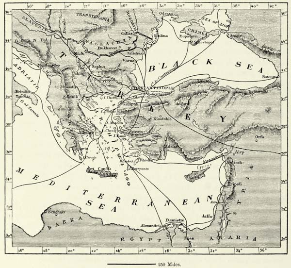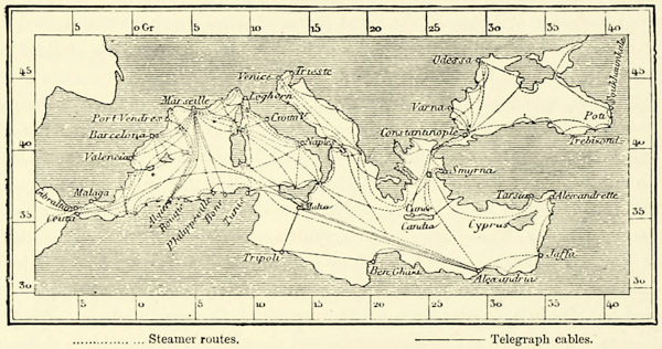 It is a remarkable fact that each of the European peninsulas should have enjoyed in turn a period of commercial preponderance. Greece, the “most noble individuality of the world of the ancients,” came first, and when at the height of her power governed the Mediterranean, which at that time meant nearly the whole universe. During the Middle Ages Amalfi, Genoa, and Venice became the commercial agents between Europe and the Indies. The discovery of a passage round the Cape and of America diverted the world’s commerce to Cadiz, Seville, and Lisbon, on the Iberian peninsula. Subsequently the merchants of the small Dutch Republic seized a portion of the heritage of Spain and Portugal, and the wealth of the entire world was floated into the harbours of their sea-bound islands and peninsulas. In our own days Great Britain, thanks to its favourable geographical position, in the very centre of great continental masses, and the energy of its people, has become the great mart of the world. London, the most populous city of the world, is also the great centre of attraction for the treasures of mankind; but there can be no doubt that sooner or later it will be supplanted, in consequence of the opening of new commercial high-roads, and changes in the political preponderance of nations. Perhaps some city of the United States will take the place of London in a future age, and thus the American belief in the westward march of civilisation will be verified; or we may possibly return to the East, and convert Constantinople or Cairo into the world’s emporium and centre of intercourse.