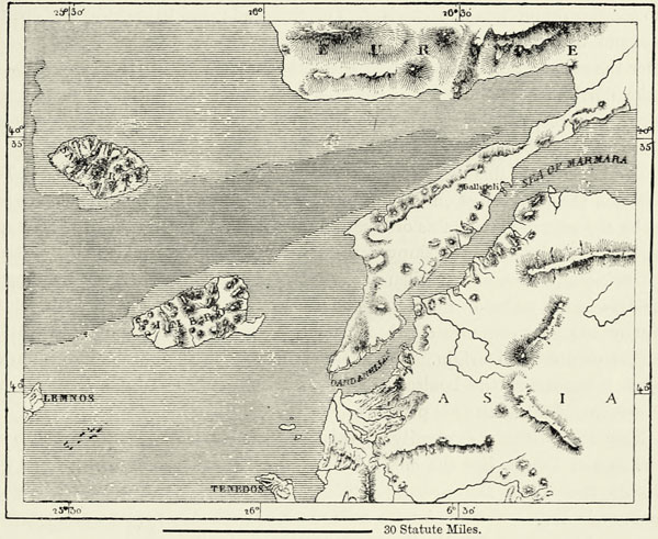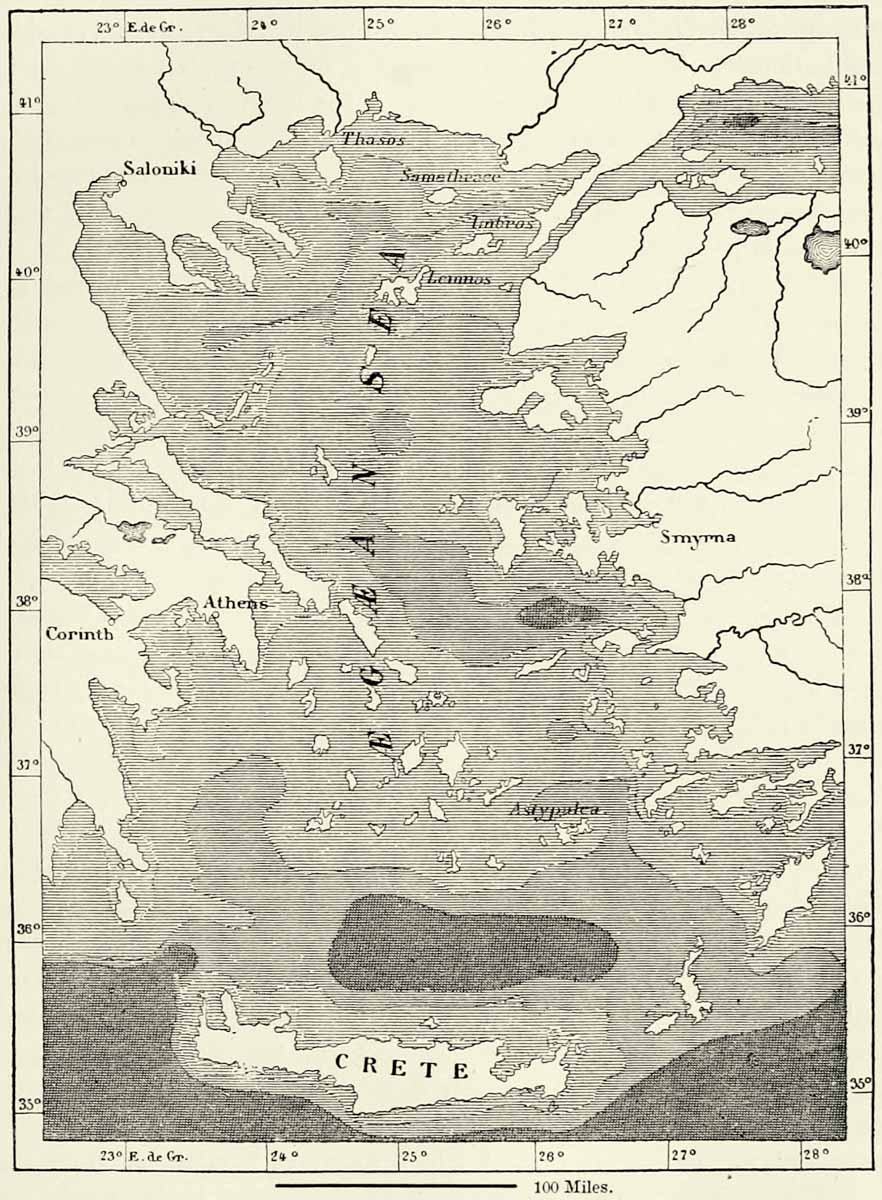 The islands of Europe must be looked upon as dependencies of that continent, for most of them are separated from it only by shallow seas. Candia and the islands scattered broadcast over the Ægean Sea, the Archipelagos of the Ionian Sea, and of Dalmatia, Sicily, Corsica and Sardinia, Elba, and the Baleares, are in reality but prolongations, or maritime out-stations, of neighbouring peninsulas. To the islands of Sealand and Fyen, at the entrance to the Baltic, Denmark owes {15} most of her commercial and political importance. Great Britain and Ireland, which actually formed a portion of the European continent in a past age, cannot be looked upon otherwise than as dependencies of it, although the isthmus which once joined them has been destroyed by the waters of the ocean. England has actually become the grand commercial emporium of Europe, and plays now the same part in the world’s commerce that Greece once played in that of the more restricted world of the Mediterranean.