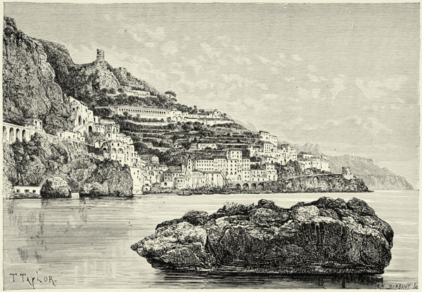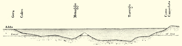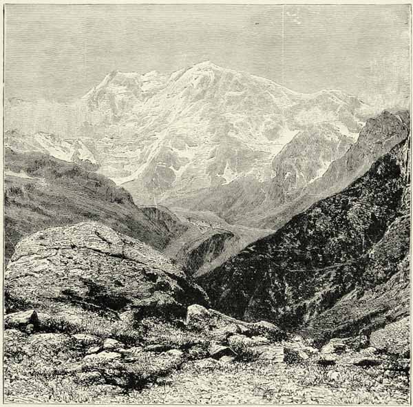 The Alps, whose ancient Celtic name probably refers to the whiteness of their snowy summits, stretch in an immense curve, more than 600 miles in length, from the shores of the Mediterranean to the plains of the Danube. They consist in reality of more than thirty mountain masses, representing as many geological groups, and joined to each other by elevated passes; but their rocks, whether they be granite, slate, sandstone, or limestone, form one continuous rampart rising above the plains. In former ages the Alps were higher than they are now. This is proved by an examination of their detritus and of the strata disintegrated by natural agencies. But, whatever the extent of detrition, they still rise in hundreds of summits beyond the line of perennial snow, and vast rivers of ice descend from them into every upland valley. Looked at from the plains of Piedmont and Lombardy, these glaciers and snow-fields present the appearance of sparkling diadems encircling the mountain summits.