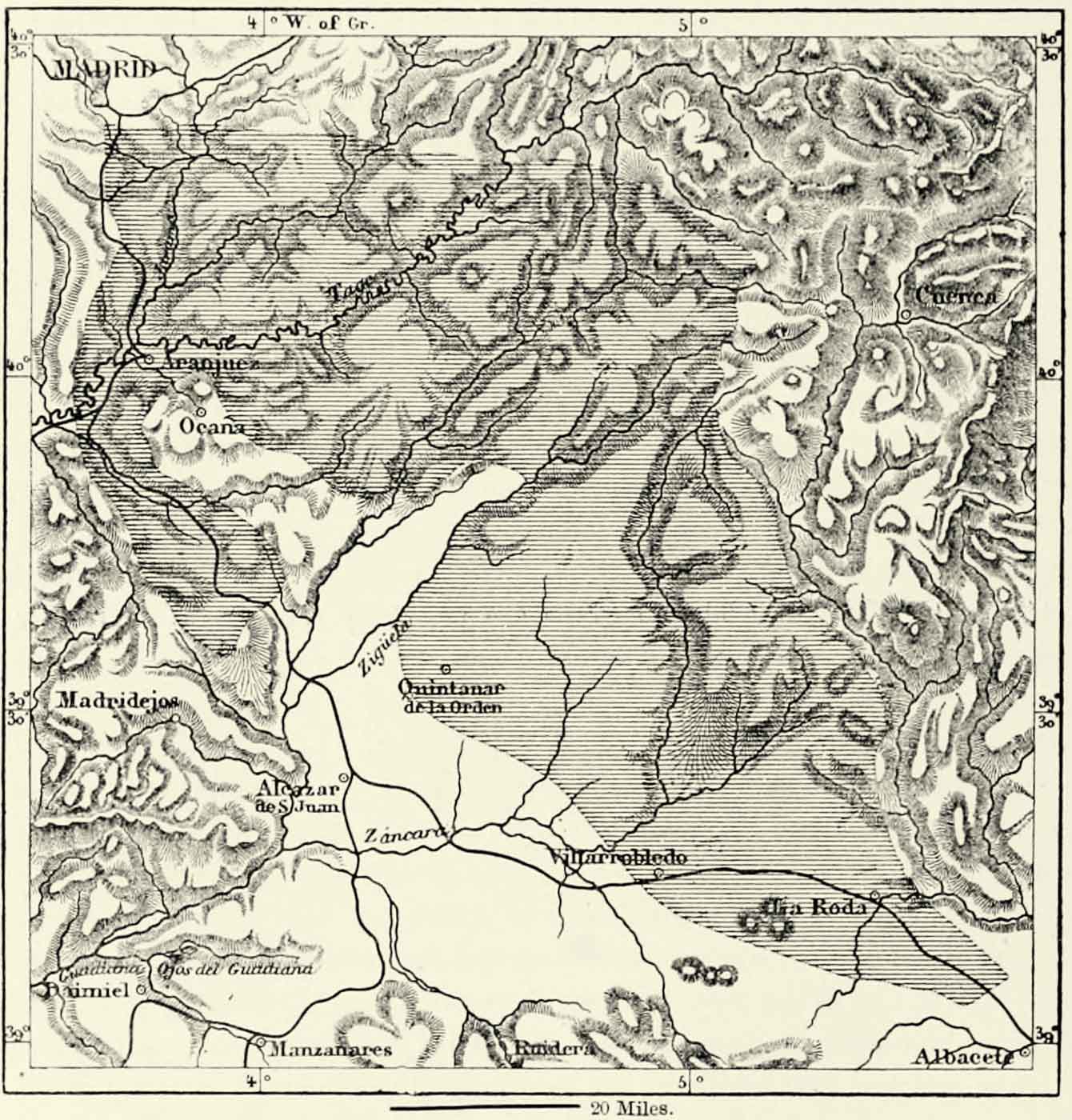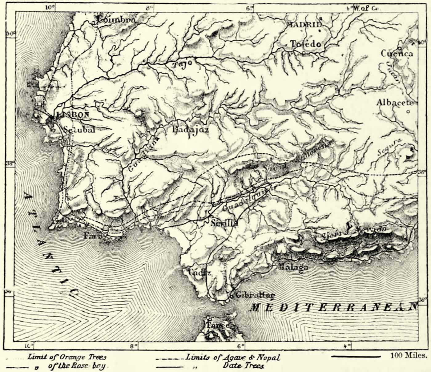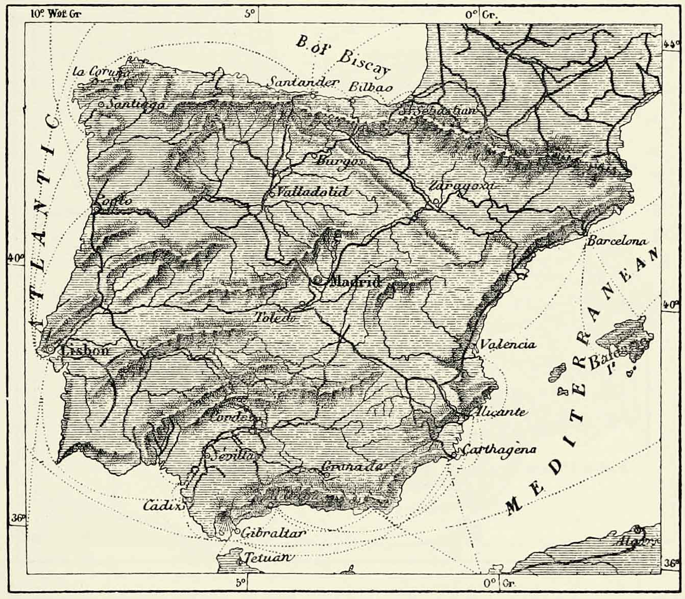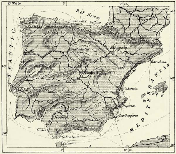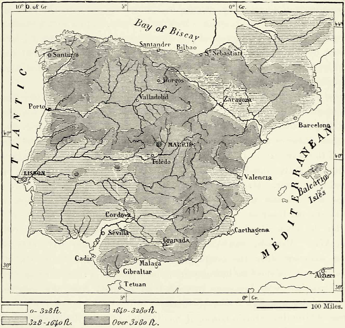 The Europe alluded to includes France, Germany, England, and the three Mediterranean peninsulas, and constitutes several natural divisions. The British Islands form one of these. The Iberian peninsula is separated scarcely less {10} distinctly from the remainder of Europe, for between it and France rises a most formidable range of mountains, the most difficult to cross in all Europe; and immediately to the north of it a depression, nowhere exceeding a height of 650 feet, extends from the Mediterranean to the Atlantic Ocean. The geographical unity of Europe is represented to the full extent only in the system of the Alps, and in the mountains of France, Germany, Italy, and the Balkan peninsula which are connected with it. It is there we must seek the framework of continental Europe.