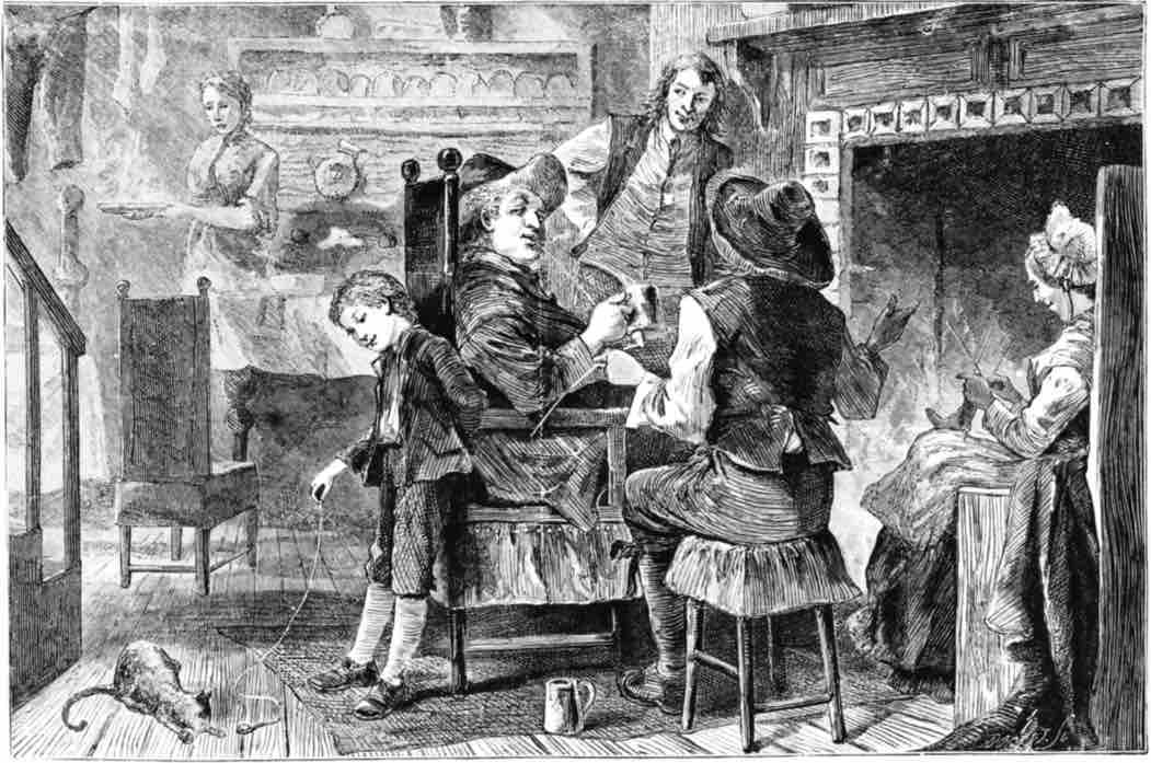 The dress in those days was not the same as it is now. The men wore small clothes, which came to the knee like a small boy's in these times, and they had stiff ruffs round their necks and caps of rich stuff on their heads. The young men wore fine belts, and great high boots which were made with a roll at the top. The girls wore silk hoods in the 25 streets, and stiff rich gowns, with long waists, and lace caps on feast-days. But folks could not wear gay clothes if the law did not think they had means to spend for such fine things.